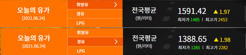 연료가격을 연비로 나눠주면 주행거리 km당 비용이 얼마가 되는지 알 수 있다.