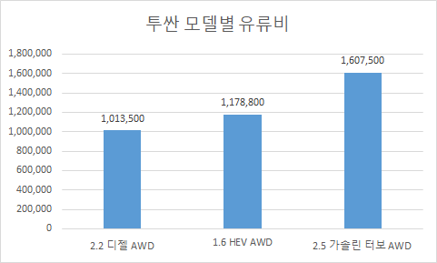 가솔린, 디젤, 하이브리드 각 연료별 모델은 다르지만 4륜구동(AWD) 모델로 통일해서 유류비를 계산해보자.