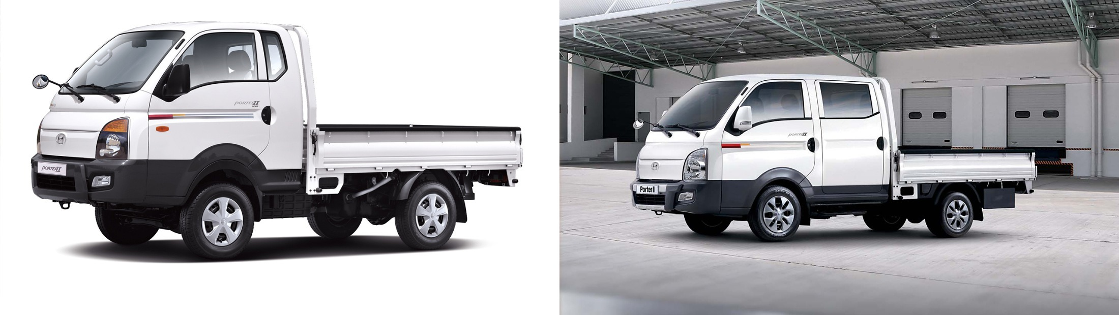 왼쪽 트럭이 장축 슈퍼캡 포터2, 오른쪽 트럭이 초장축 슈퍼캡 포터2 입니다.