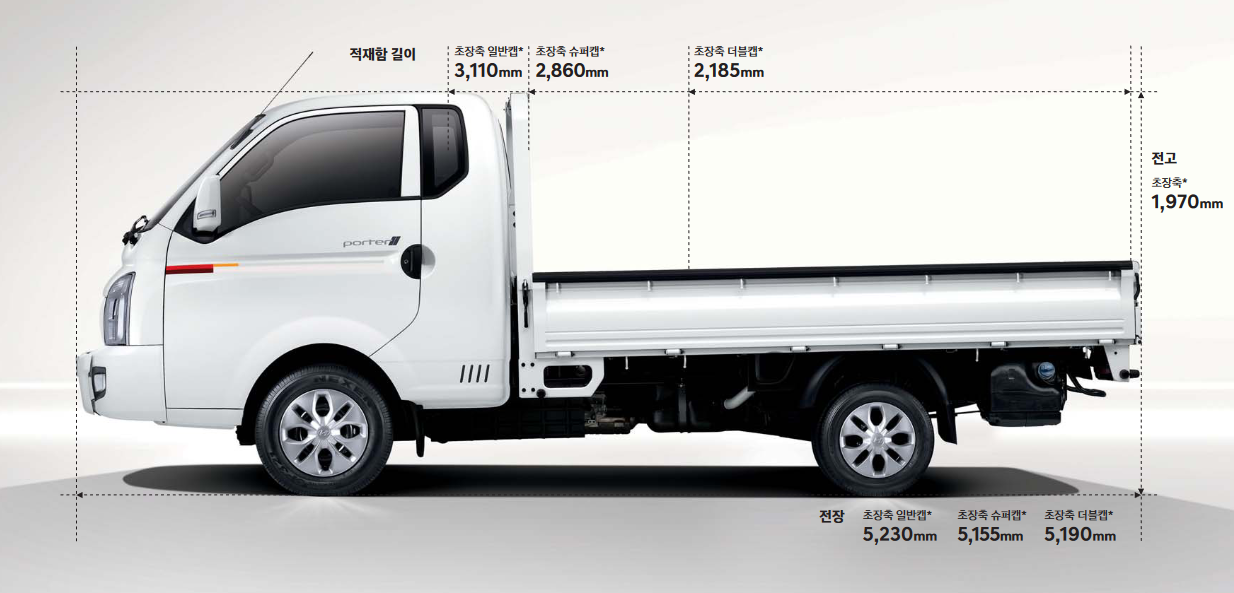 1톤 트럭 종류 - 장축, 초장축, 일반캡, 슈퍼캡, 더블캡(현대 포터2, 기아 봉고3)