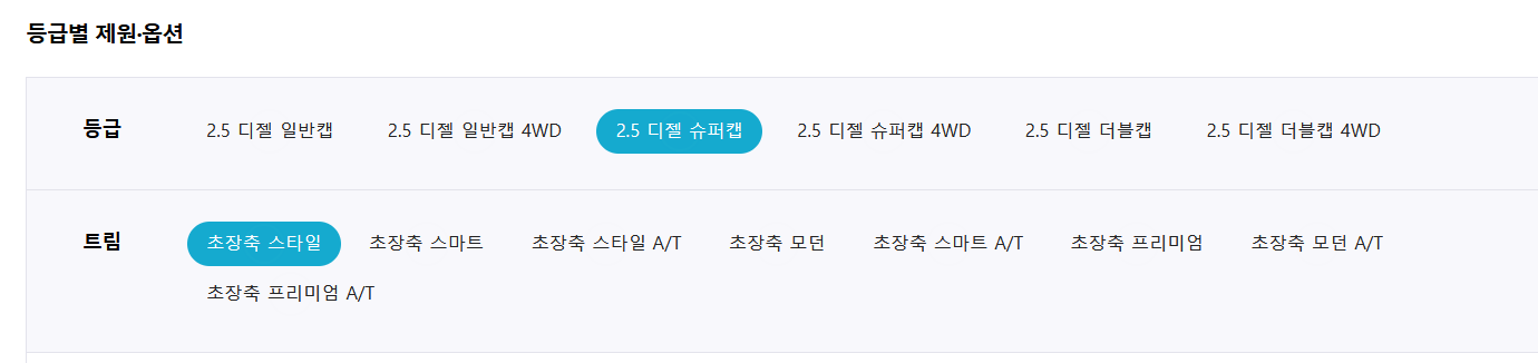 | 일반캡 장축 | 일반캡 초장축 | 슈퍼캡 장축 | 슈퍼캡 초장축 | 더블캡 장축 | 더블캡 초장축 |