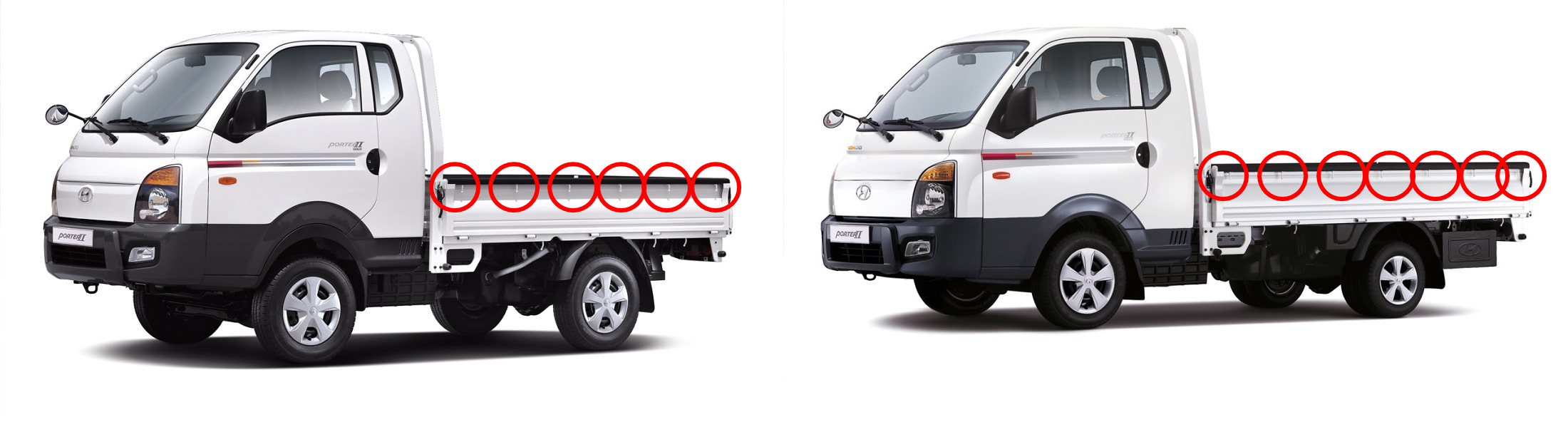 장축과 초장축은 트럭 적재함 끝에 달린 고리의 갯수로 구분할 수 있습니다.