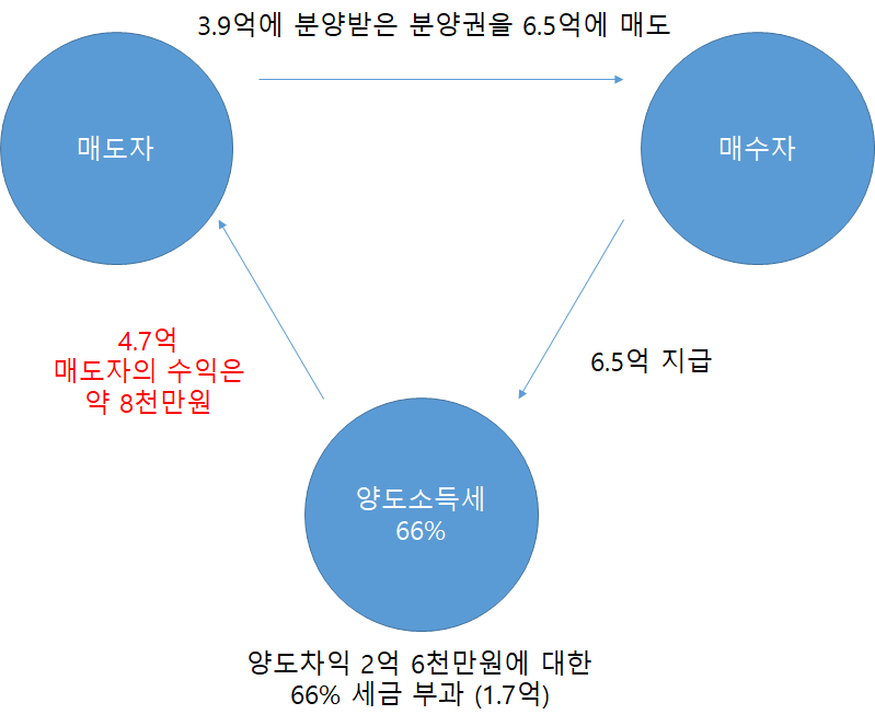 매도자가 손피 2억 6,785만원을 원한다면 6억 5천만원에 분양권을 사는 건 어렵습니다. 그 이유는 바로 양도세입니다.