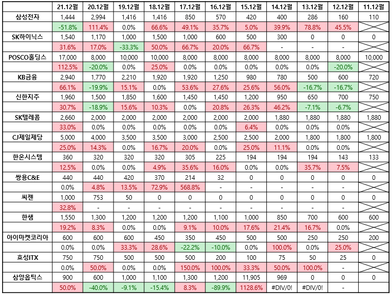 삼성전자와 SK하이닉스는 꾸준히 배당을 올렸지만 최근에 배당을 낮춘 이력이 있습니다.
