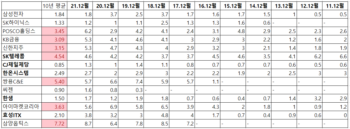 그리고 빨간색으로 표시한 것은 10년 평균 배당수익률이 3%이상인 기업입니다.