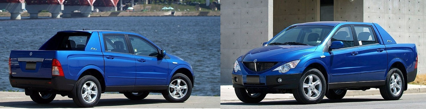 위 픽업트럭은 코란도 스포츠로, 정확히는 액티언 스포츠 후기형 모델로 생산되었던 자동차입니다. 픽업트럭이 아닌 SUV로 출시된 코란도 중에 이런 디자인을 가지고 있는 것은 없습니다.