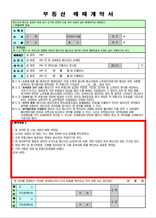 위 사진은 실제 부동산 계약시 쓰는 양식입니다. 강조표시한 부분이 특약사항을 적는 곳입니다.