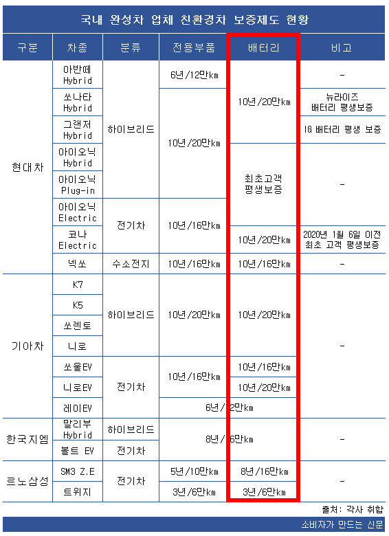 국내 완성차 업체 하이브리드 배터리 보증 현황 - 10년/ 20만km