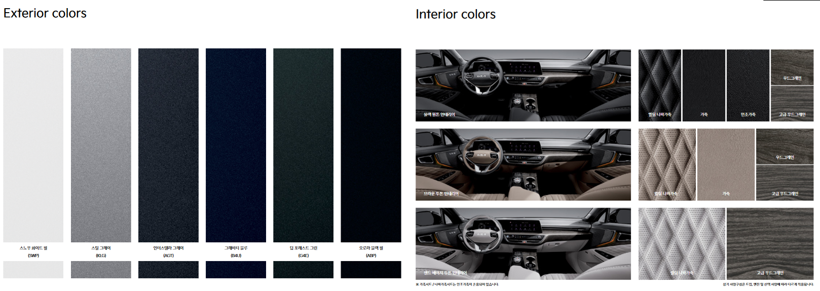 외장의 경우 컬러는 총 6가지이며, 내부 인테리어 색상은 크게 3가지로 나뉩니다.