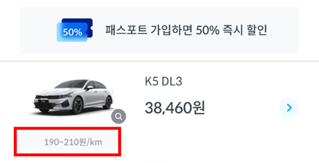 쏘카 예약할 때 화면에 보면 190 ~ 210원/km, 180원 ~ 200원/km 라고 써있는 주행요금을 보실 수 있습니다. 총 몇 km 운행했을 때 얼마가 부과될지를 예측해 볼 수 있습니다. 운행거리가 길수록 주행요금은 많이 부과됩니다. K5를 선택하신 경우 10km 운행하면 2100원이지만, 100km가 넘어가면 그 금액은 더 커집니다.
