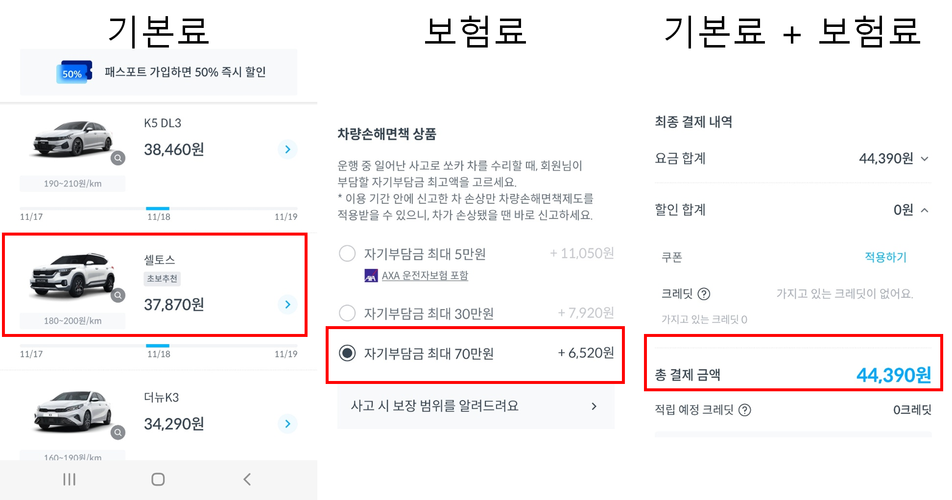 차를 대여할때 기본적으로 부과되는 기본요금입니다. 기본요금은 대여시간이 길어질수록 많이 부과됩니다.