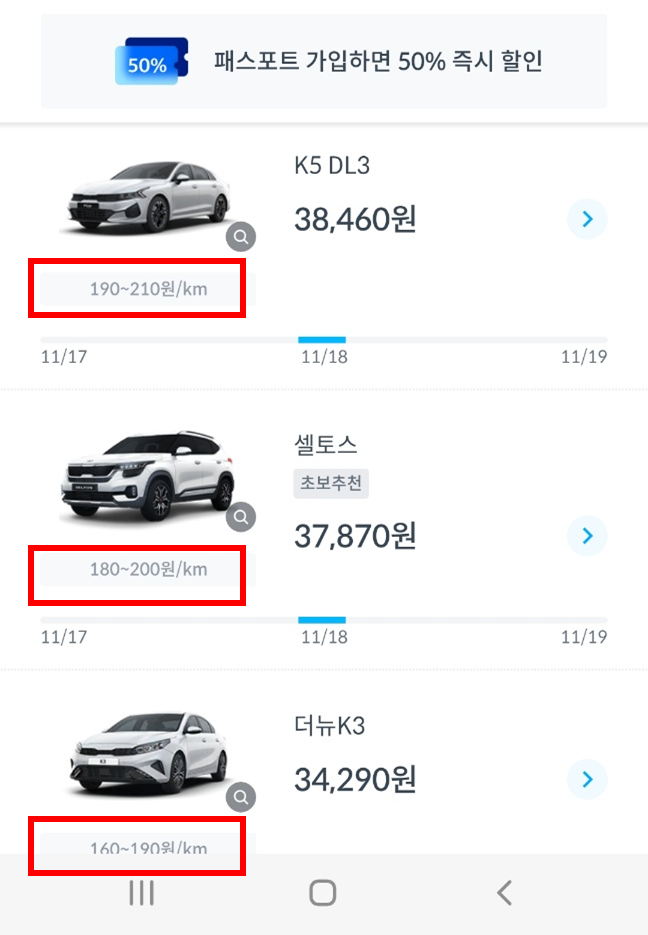 쏘카 예약할 때 화면에 보면 190 ~ 210원/km, 180원 ~ 200원/km 라고 써있는 주행요금을 보실 수 있습니다. 총 몇 km 운행했을 때 얼마가 부과될지를 예측해 볼 수 있습니다. 운행거리가 길수록 주행요금은 많이 부과됩니다. K5를 선택하신 경우 10km 운행하면 2100원이지만, 100km가 넘어가면 그 금액은 더 커집니다.