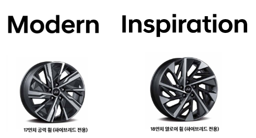 투싼 하이브리드는 17인치, 18인치 두 가지 전용 휠로 나뉩니다. 모던은 17인치 공력 휠, 인스퍼레이션은 18인치 알로이 휠입니다.