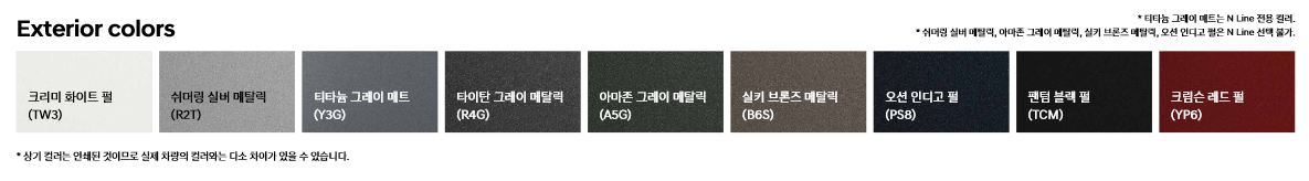 외장 컬러는 크게 9종류가 있으며, 내부 컬러는 3가지가 있습니다. N Line 전용 컬러가 따로 있습니다.