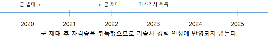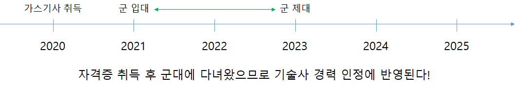 본인이 가스기사 자격증을 가지고 있고 군 경력 2년이라고 가정하면, 실무경력 2년만 쌓으면 기술사 응시자격을 얻게 된다.