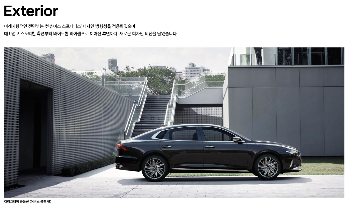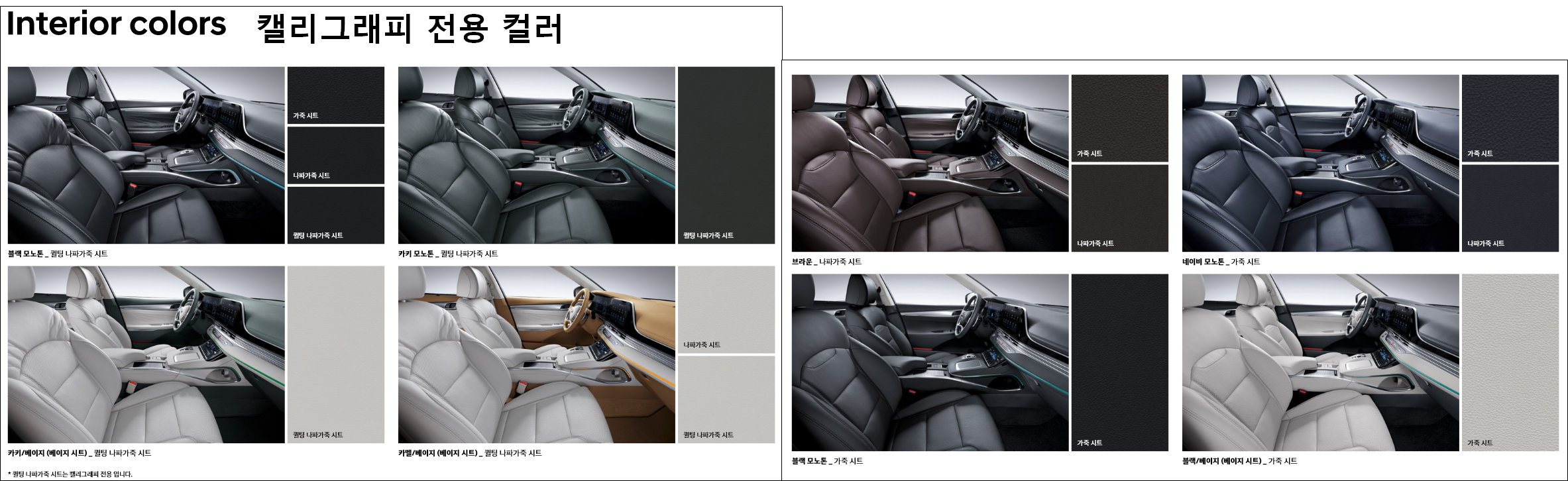외장 컬러는 크게 5종류가 있으며, 내부 컬러는 캘리그래피 전용 컬러와 이외 트림 컬러로 구분됩니다. 확실히 캘리그래피 내부 컬러가 훨씬 이쁘네요.특히 화이트 & 베이지 컬러가 가장 맘에 듭니다. 하지만 이 컬러를 하려면 가장 비싼 트림을 선택해야 합니다. 역시 현대자동차입니다.