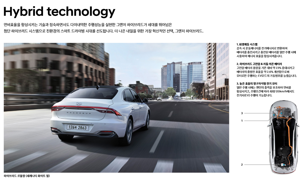 좀 더 자세한 사항은 현대 그랜저 하이브리드 카탈로그를 참고하시면 되겠습니다.