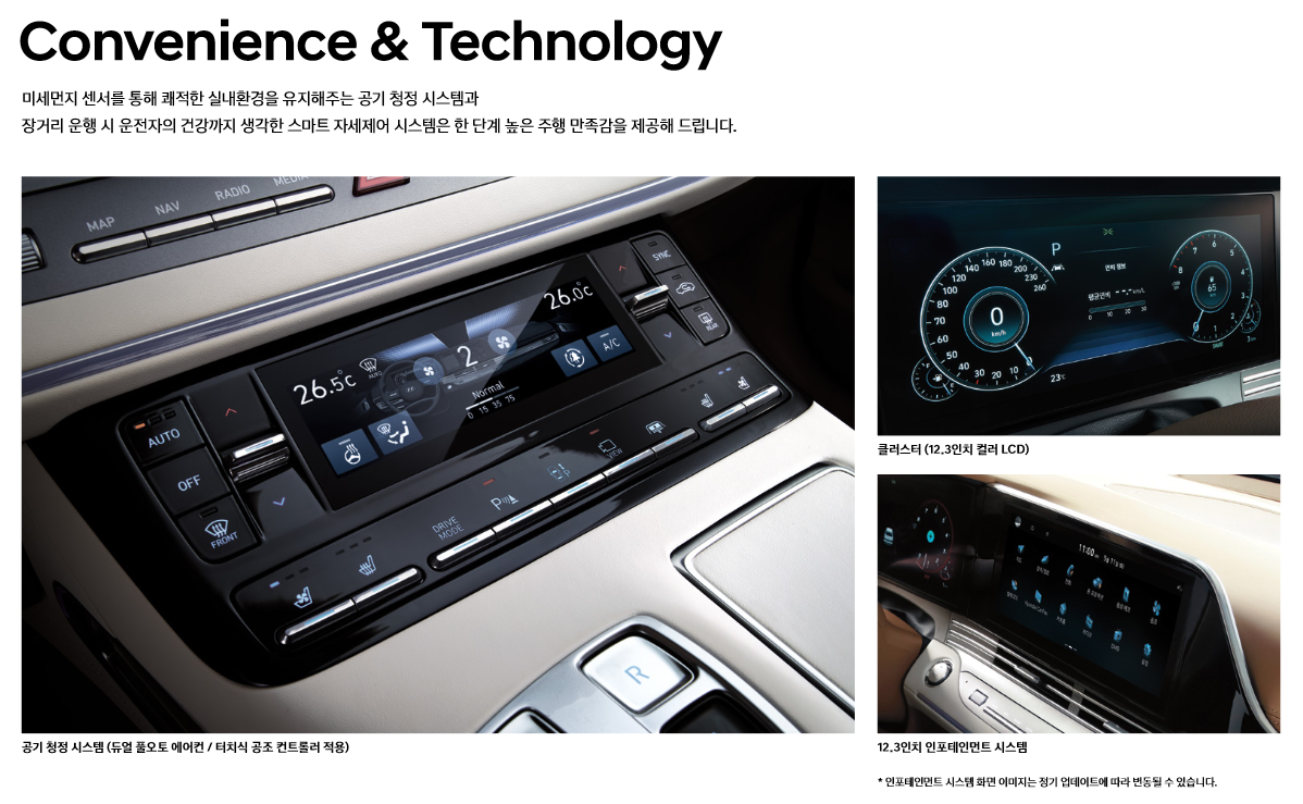 그랜저급 정도 되니 트림별로 전자기기 부품 차이는 크게 없습니다. 그 이외에 마감처리 부분에서 차이가 많이 납니다. 그랜저 정도 되니 큰 부분의 차이는 거의 없네요. 인포테인먼트, LCD 클러스터, 공조 컨트롤러는 모든 트림에 공통으로 들어갑니다.