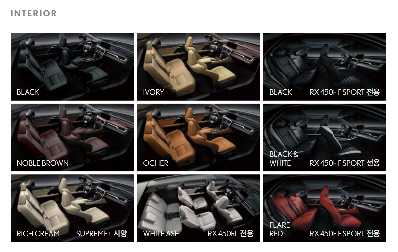 외장 컬러는 총 12가지 이며 F SPORT 전용 색상 2가지가 있습니다. 시트 색상은 총 9가지가 있습니다.