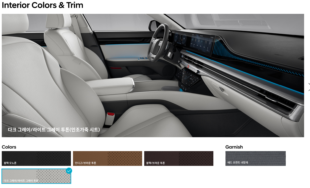 외장 컬러는 크게 5종류가 있으며, 내부 컬러는 캘리그래피 전용 컬러와 이외 트림 컬러로 구분됩니다. 확실히 캘리그래피 내부 컬러가 훨씬 이쁘네요.특히 화이트 & 베이지 컬러가 가장 맘에 듭니다. 하지만 이 컬러를 하려면 가장 비싼 트림을 선택해야 합니다. 역시 현대자동차입니다.