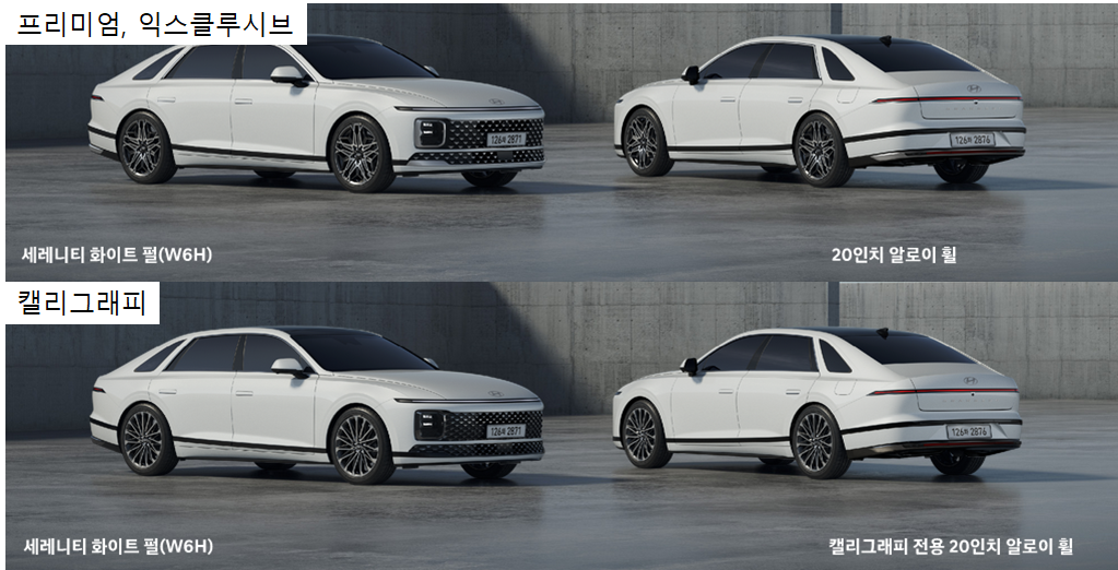 위 사진을 보시면 프리미엄, 익스클루시브의 디자인과 캘리그래프(최상위 트림)의 라디에이터 그릴 디자인과 창틀 크롬 컬러가 다릅니다. 트림별 차이를 두면서 최상위 트림은 캘리그래피 트림의 희소성을 부각시키는 것 같습니다. 그래야 고객들이 웃돈을 주고서라도 현대 그랜저 gn7 캘리그래피를 선택할테니까요. 캘리그래피 그릴 디자인이 좀 더 고급스럽고 깔끔한 느낌입니다.