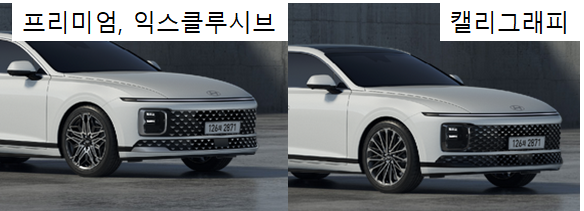 위 사진을 보시면 프리미엄, 익스클루시브의 디자인과 캘리그래프(최상위 트림)의 라디에이터 그릴 디자인과 창틀 크롬 컬러가 다릅니다. 트림별 차이를 두면서 최상위 트림은 캘리그래피 트림의 희소성을 부각시키는 것 같습니다. 그래야 고객들이 웃돈을 주고서라도 현대 그랜저 gn7 캘리그래피를 선택할테니까요. 캘리그래피 그릴 디자인이 좀 더 고급스럽고 깔끔한 느낌입니다.