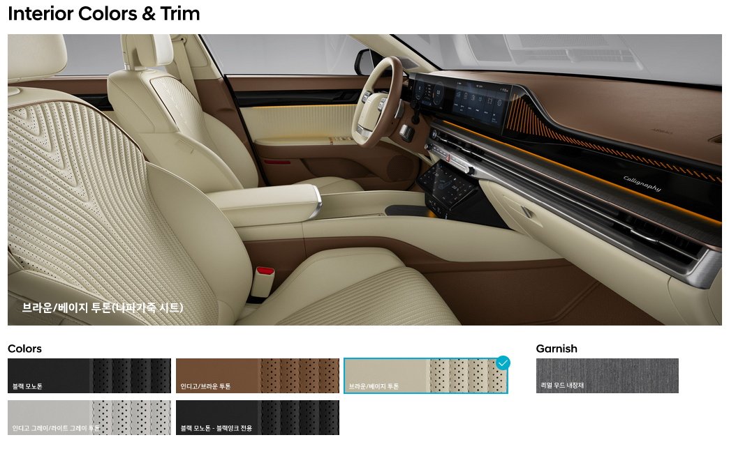 외장 컬러는 크게 5종류가 있으며, 내부 컬러는 캘리그래피 전용 컬러와 이외 트림 컬러로 구분됩니다. 확실히 캘리그래피 내부 컬러가 훨씬 이쁘네요.특히 화이트 & 베이지 컬러가 가장 맘에 듭니다. 하지만 이 컬러를 하려면 가장 비싼 트림을 선택해야 합니다. 역시 현대자동차입니다.