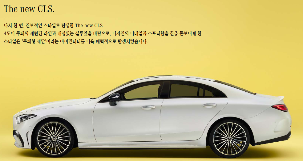 벤츠 CLS는 벤츠 E클래스와 벤츠 S클래스의 중간급 모델로, 쿠페형 세단이라는 콘셉을 가장 처음 적용한 자동차입니다.쿠페이지만 4도어로 한국에서 인기가 많은 모델이기도 합니다. 벤츠 E클래스, 벤츠 S클래스보다 더 세련되고 스포티한 디자인을 가지고 있기 때문입니다. 그러면서 크기도 크기 때문에 S클래스처럼 너무 무겁고 웅장한 느낌을 선호하지 않는 고객에게 인기가 많습니다.