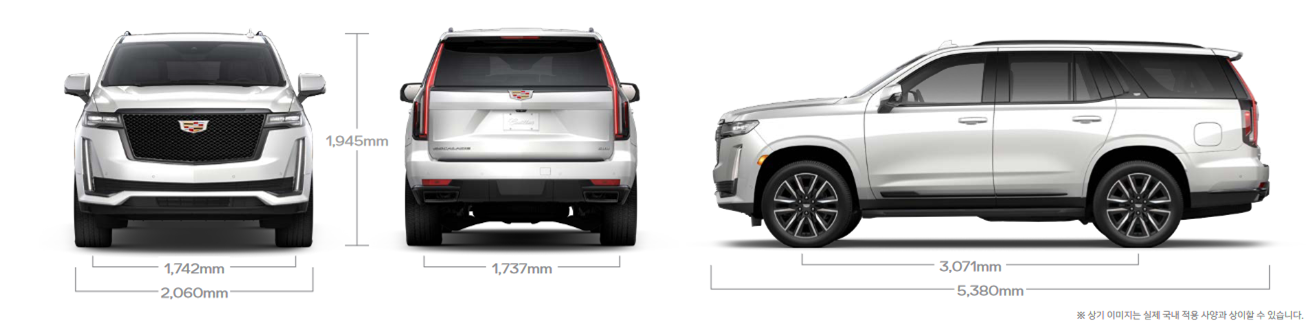 캐딜락 에스컬레이드는 일반 모델과 ESV 모델이 있습니다. ESV는 롱 휠 베이스 버전으로 크기가 무려 5,765mm에 달합니다. 거의 6m에 가까운 크기입니다. 실제로 보면 엄청 클 겁니다.