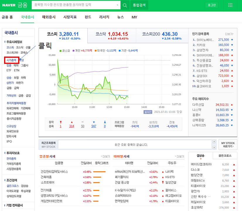 이번 포스팅에서는 국내 주식 시가총액 순위 보는 법을 알아보겠습니다.