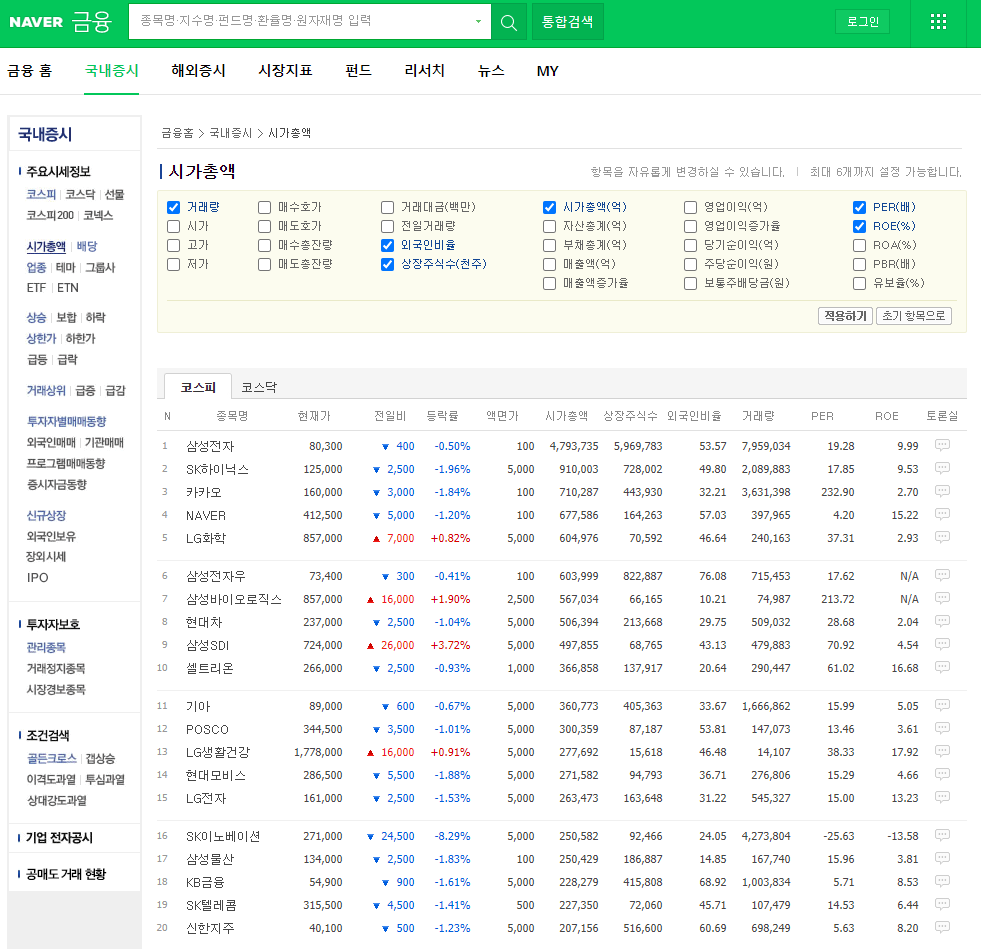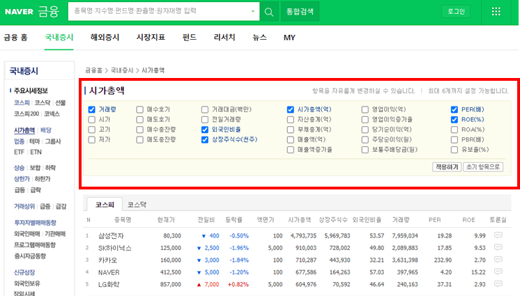 그리고 시가총액과 더불어 본인이 원하는 지표 등을 선택해서 볼 수 있습니다. 저는 주로 PER와 ROE를 중요하게 보는 편입니다.