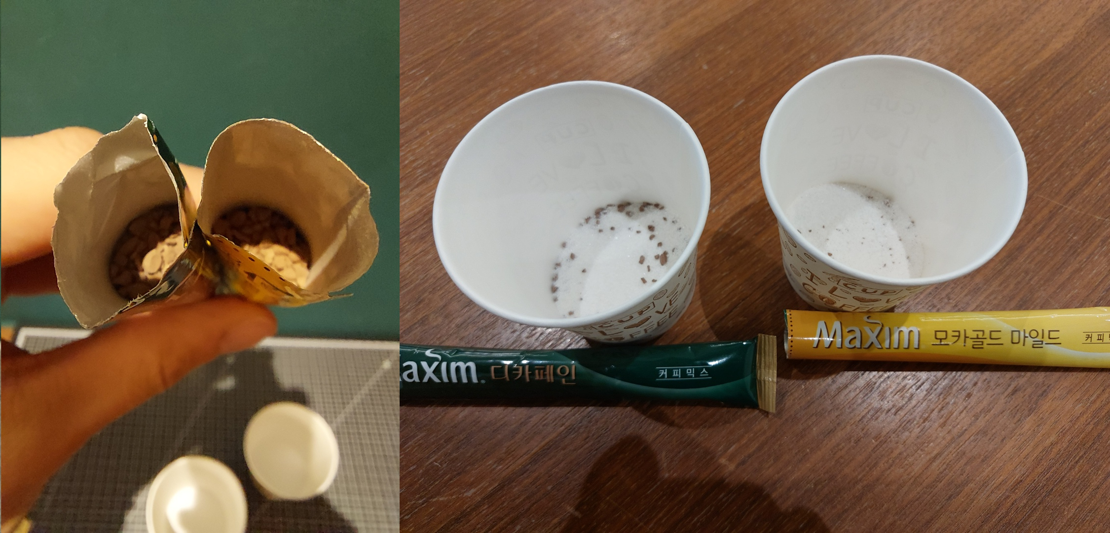 스틱을 뜯어서 각각 컵에 따라보았는데, 겉으로 보기에는 거의 차이가 없었습니다. 아무래도 카페인은 화학물질 중에 하나이기 때문에 사실 눈에 보이지 않습니다.