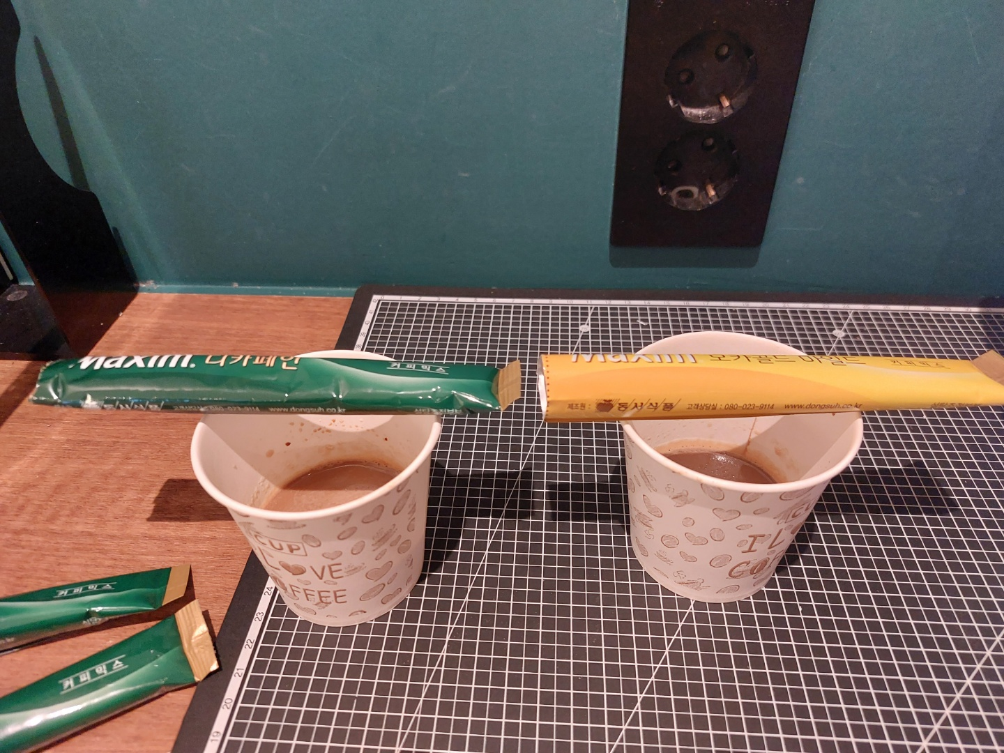 물도 동일한 양을 따라주었습니다. 약간 모카골드 마일드 쪽이 좀 더 하얀 것 같기도 합니다. 프림이 더 많이 들어있는 걸까요?