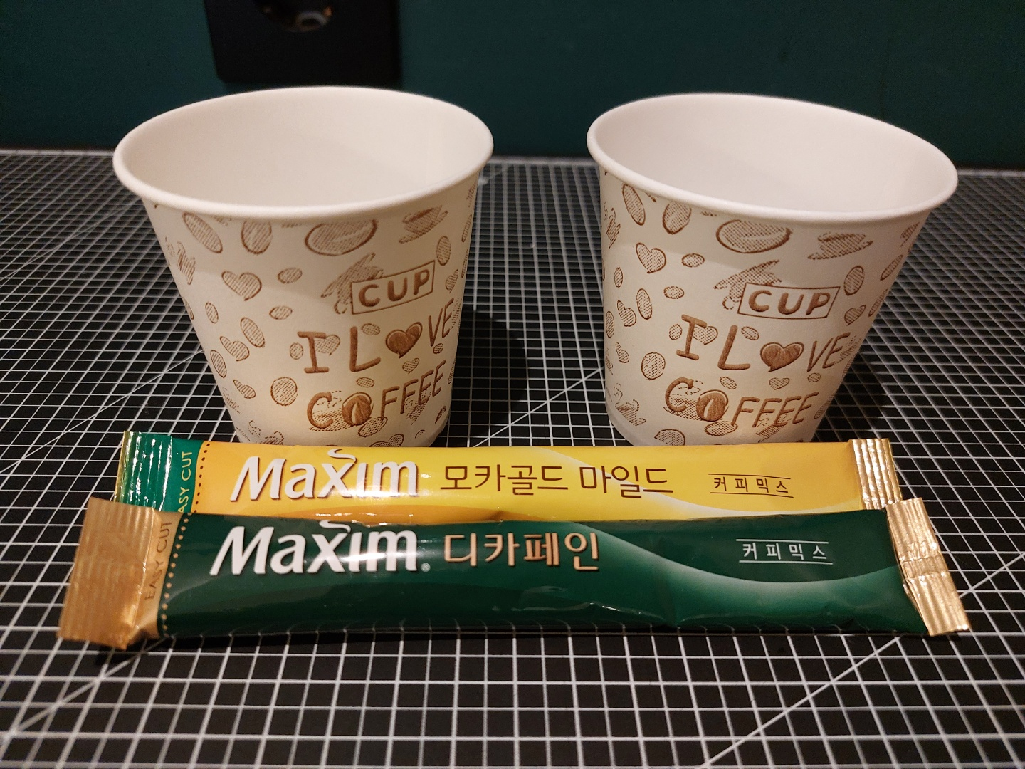 스틱을 뜯어서 각각 컵에 따라보았는데, 겉으로 보기에는 거의 차이가 없었습니다. 아무래도 카페인은 화학물질 중에 하나이기 때문에 사실 눈에 보이지 않습니다.
