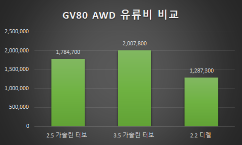 제네시스 GV80 가솔린, 디젤 유류비 비교 - 후륜구동 모델