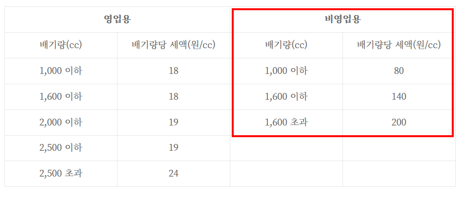위 표를 보시면 비영업용 자동차(우리가 흔히 타는 승용차)는 1,600cc를 초과하면 cc당 200원이 부과됩니다. 1,600cc가 넘어가지 않으면