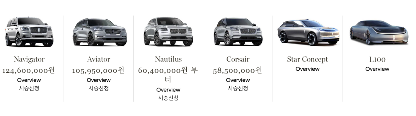 | 링컨 네비게이터 | 링컨 에비에이터 | 링컨 노틸러스 | 링컨 코세어 |