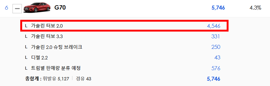 원래는 디젤 엔진도 있었으나 22년도 모델로는 2.0 가솔린과 3.3 가솔린만 판매하고 있습니다. 이번 포스팅에서는 2.0 가솔린 엔진 G70을 알아보겠습니다. 판매량을 보니 디젤 엔진은 정말 안팔리는군요.