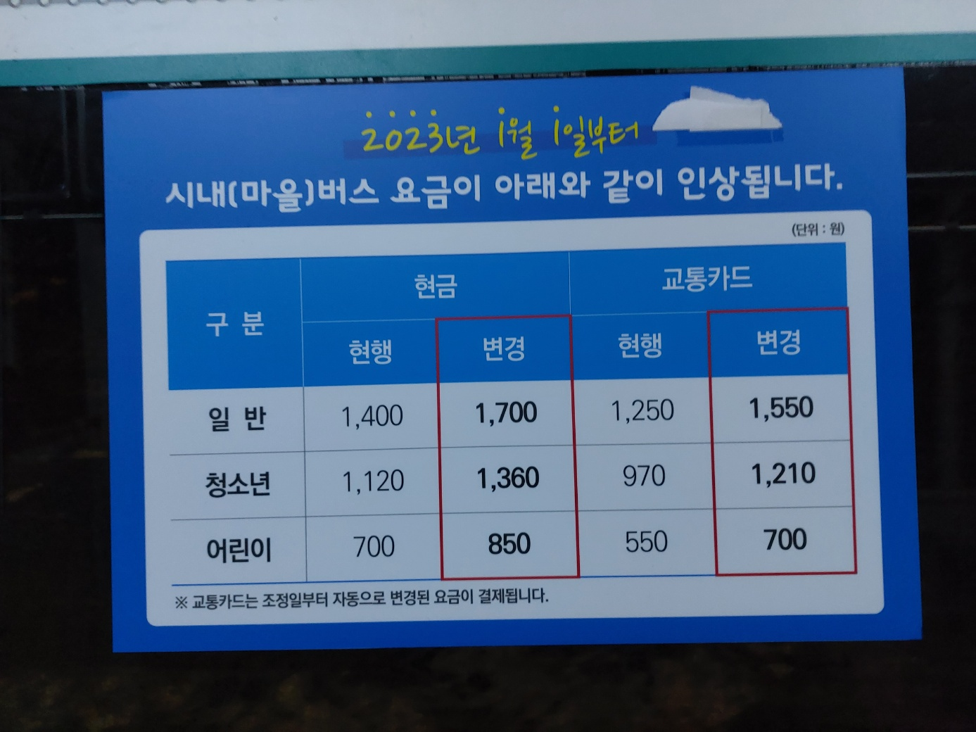 오랜만에 춘천에 놀러갔다가 시내버스를 탔는데, 버스 요금 인상 안내문이 붙어있었습니다.