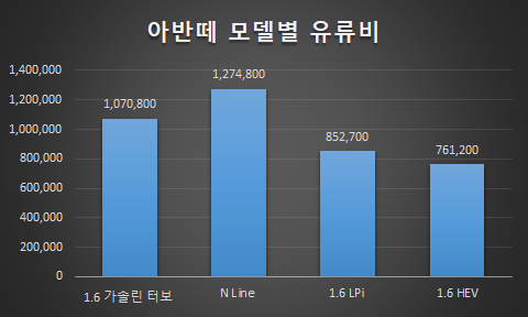 준중형 세단 판매 1위를 달리고 있는 현대 아반떼의 유류비를 비교해보자.