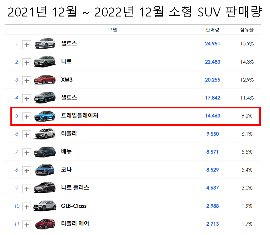 쉐보레 트레일블레이저는 소형 SUV 중에서 가장 가격이 비쌉니다. 연비는 그저 그런데 가격은 제일 비쌉니다.