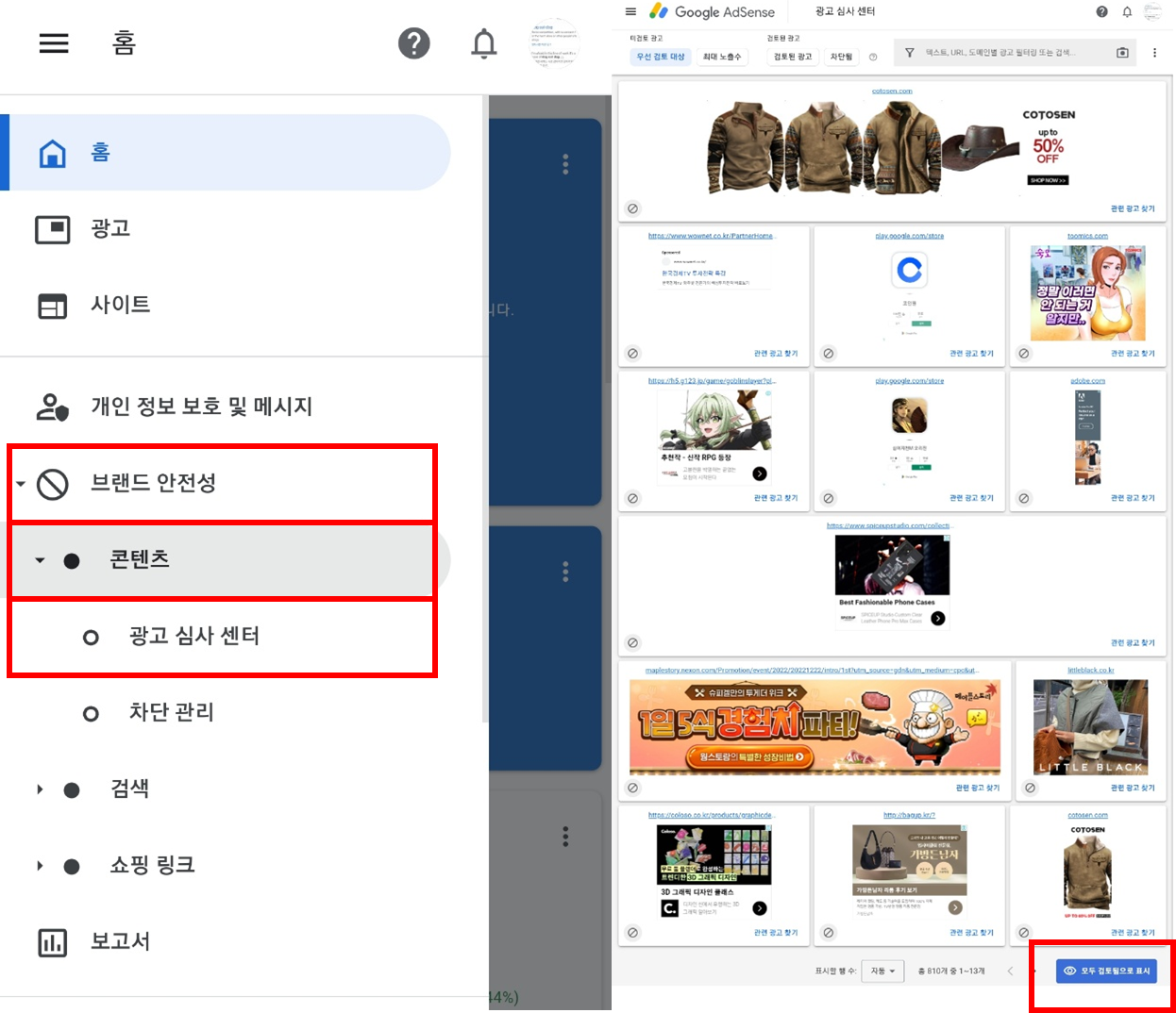 | 구글 애드센스 사이트 1. 상단 세줄 메뉴 2. 브랜드 안전성 3. 콘텐츠 4. 광고심사 센터 |