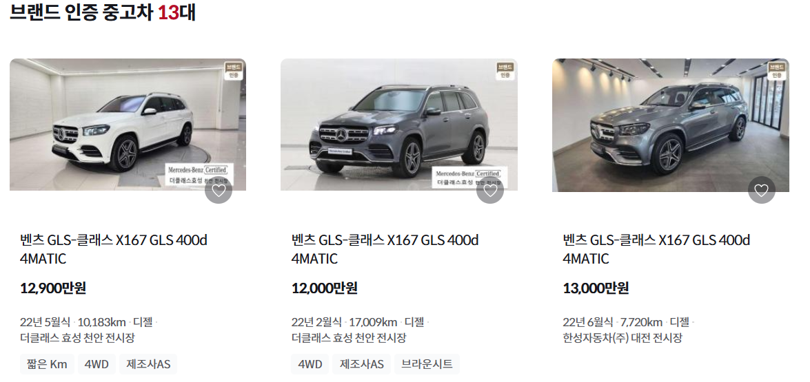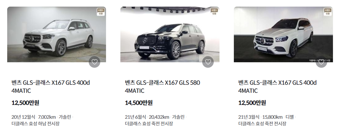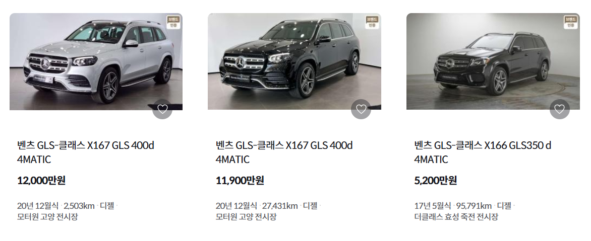 케이카에서 벤츠 GLS를 검색해보니 그래도 몇 개 중고차가 검색이 됩니다. 현재 출시되는 벤츠 GLS의 풀체인지 이전 모델입니다. 현재 판매되고 있는 벤츠 GLS 580 4.0 가솔린이 1억 7천만원인걸 감안하면 그렇게 저렴한 중고차 금액은 아닙니다. 아무래도 희소성이 있어서 그런 것일 텐데요. 그리고 벤츠 자동차이기 때문에 중고차시장에서도 비싸게 거래가 되는 것 같습니다. 그리고 중고차 가격이 높은 이유가 주행거리가 짧은 편입니다. 주행거리가 9만에 달하는 벤츠 GLS는 5천만원이면 구매가 가능하네요. 물론 수리가 필요하겠습니다. 감사합니다.