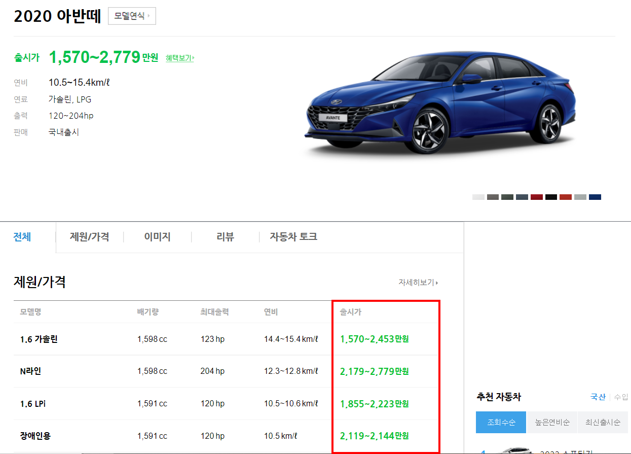 아반떼를 예로 들어 설명해보자. 위 그림 하단에 출시가를 볼 수 있다. 각 모델별 트림의 가격 범위를 나타낸 것이다.