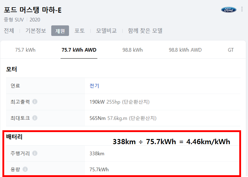1) 포드 머스탱 마하e 75.7kWh - 370km (연비: 4.88km/kWh)