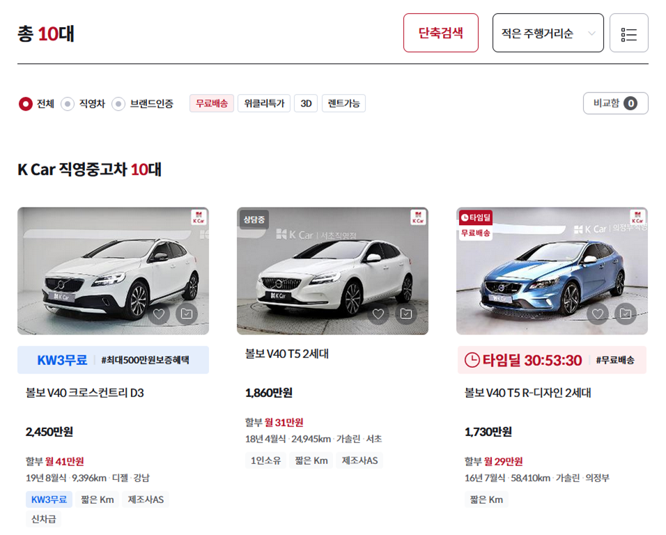 이상으로 볼보 V40 자동차세를 알아보았습니다. 1,600cc가 넘어가기 때문에 자동차는 크지 않아도 자동차세가 꽤 비싼 편입니다. 볼보 V40은 단종된 차량으로 중고차로만 구매가 가능합니다. 케이카에 조회해 보니 25000km 가솔린엔진인 볼보 V40이 괜찮아 보입니다. 가격도 적당하구요. 개인적으로 디젤 엔진은 소음때문에 별로 선호하지 않습니다. 준중형 해치백 구매를 고려 중이시라면 볼보 V40도 고려해보시면 좋겠습니다.