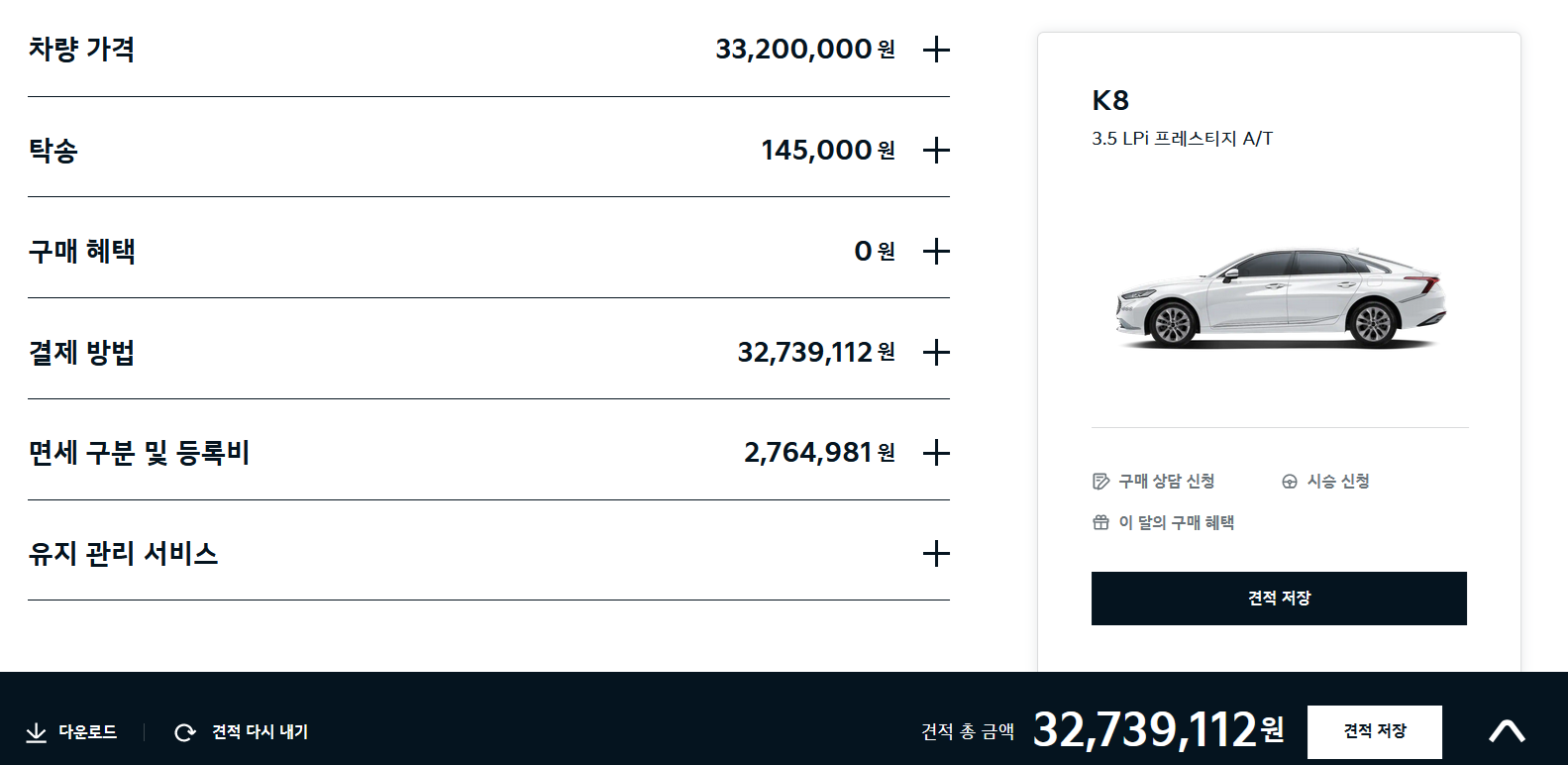 | 기아 K8 3.5 LPi 자가용 구매 | 기아 K8 3.5 LPi 영업용 구매 (택시) |