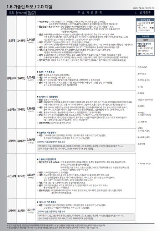 트림별 가격은 다음과 같다. 옵션에 따라 최종가격이 달라지게 된다.