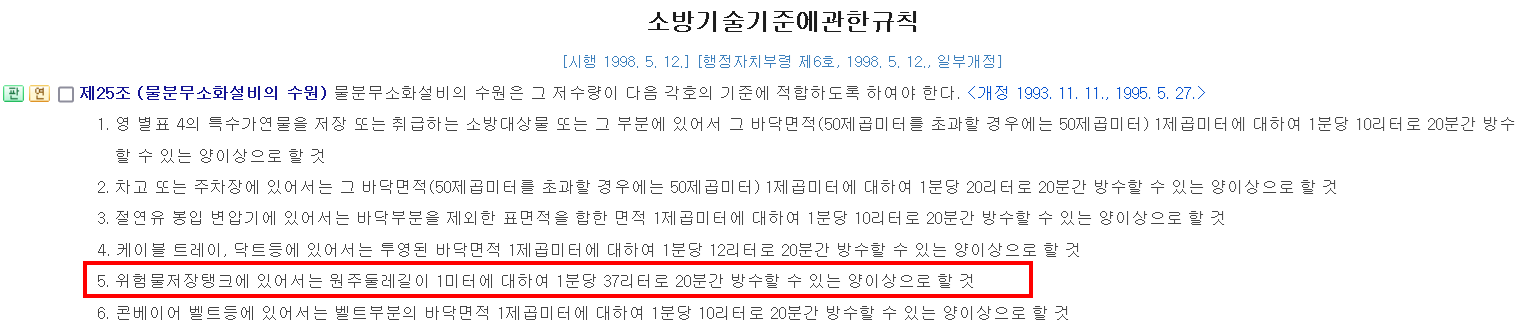 현재는 폐지된 소방기술기준에관한규칙에 위험물저장탱크에 설치해야 하는 물분무설비 수원 기준이 있다. 소방기술기준에관한규칙은 폐지된 법안으로 현재는 화재안전성능기준을 보아야 한다. 다만, 물분무소화설비의 화재안전성능기준(NFPC 104)에는 위험물저장탱크에 설치하는 물분무설비 수원의 양에 대한 기준이 없다. 왜 없는지는 좀 더 찾아봐야겠다.