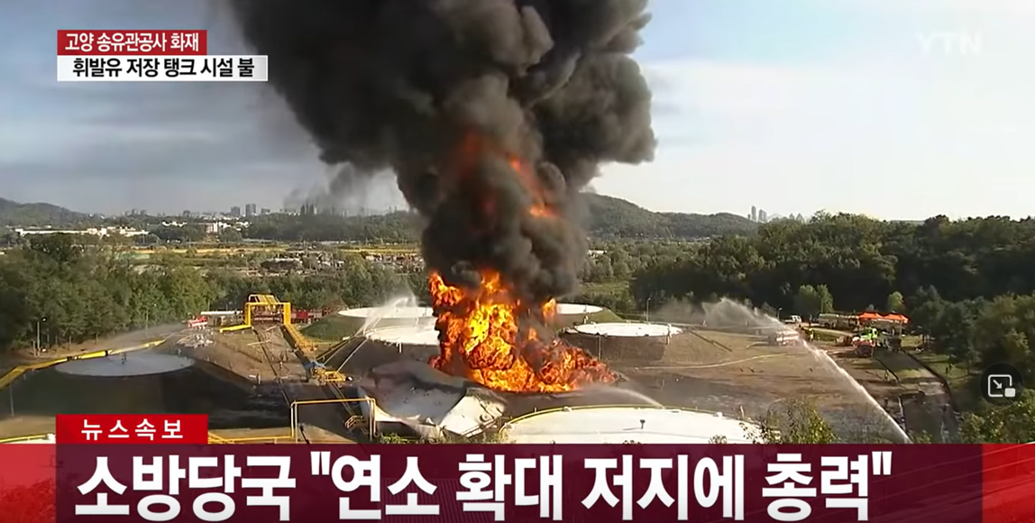2018년 7월에 일어났던 고양 저유소 화재를 기억하는가? 영상을 보면 엄청난 규모의 화염기둥이 솓구치고 있다. 소방차가 저만하니 화염기둥이 얼만한지 짐작이 될 것이다. 그리고 저유소에 있는 저장탱크 자체가 워낙 크기 때문에, 불이 붙으면 탱크에 있는 기름을 이송시키지 않는 이상 탱크 전체가 불이 붙게 된다. 현실적으로 저런 커다란 위험물유류탱크를 소화하는 건 불가능하다. 최소한 화재가 전파되지 않게 막는 것이 제일 중요하다.